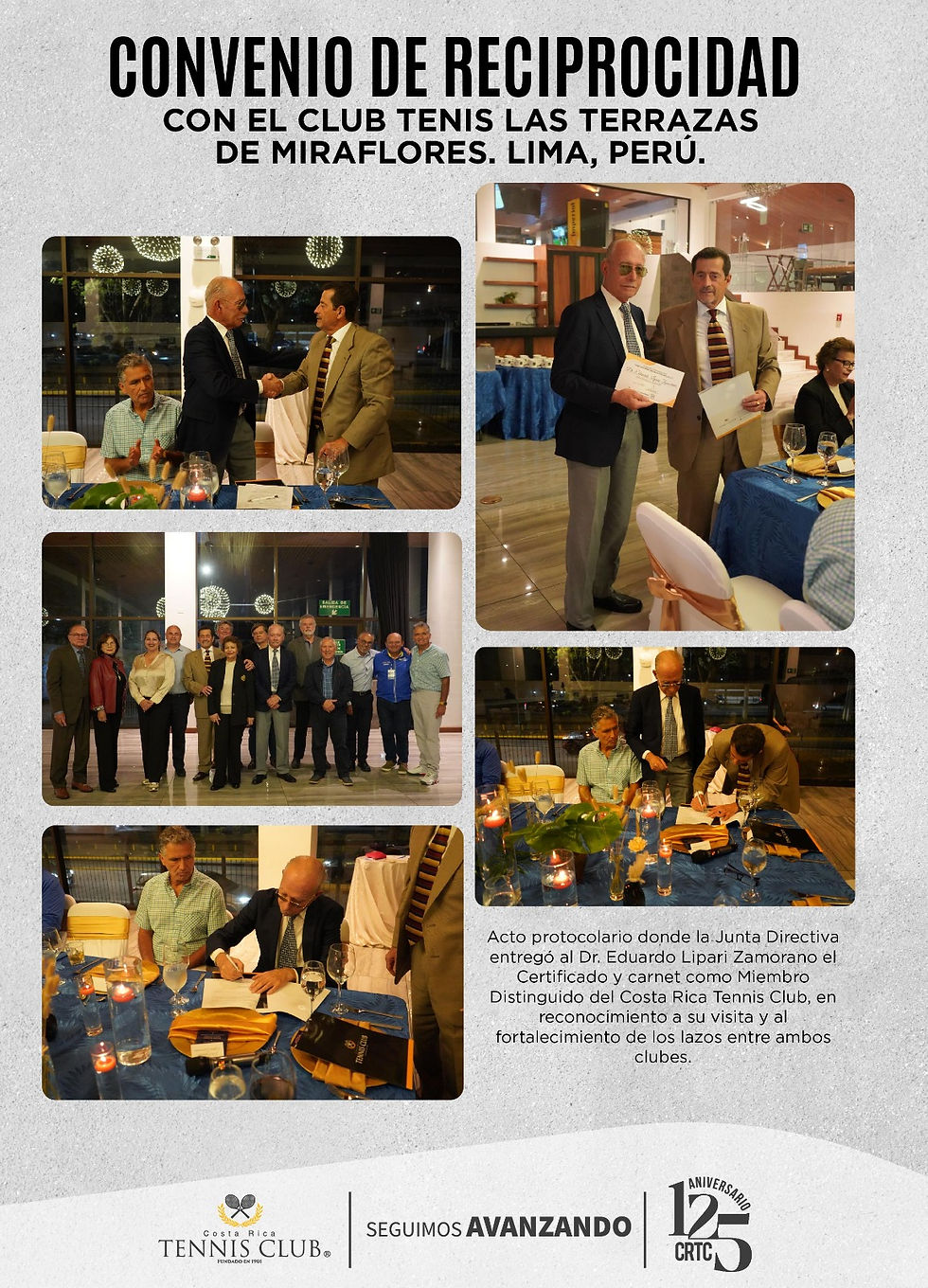 En el marco de la ceremonia, el Dr. Eduardo Lipari Zamorano fue distinguido como Miembro Distinguido del Costa Rica Tennis Club, en reconocimiento a su trayectoria y a su valioso aporte al fortalecimiento de las relaciones entre ambas instituciones.